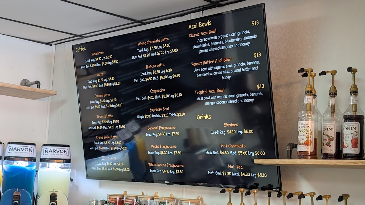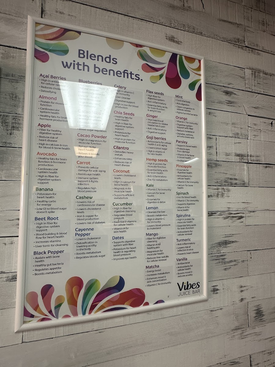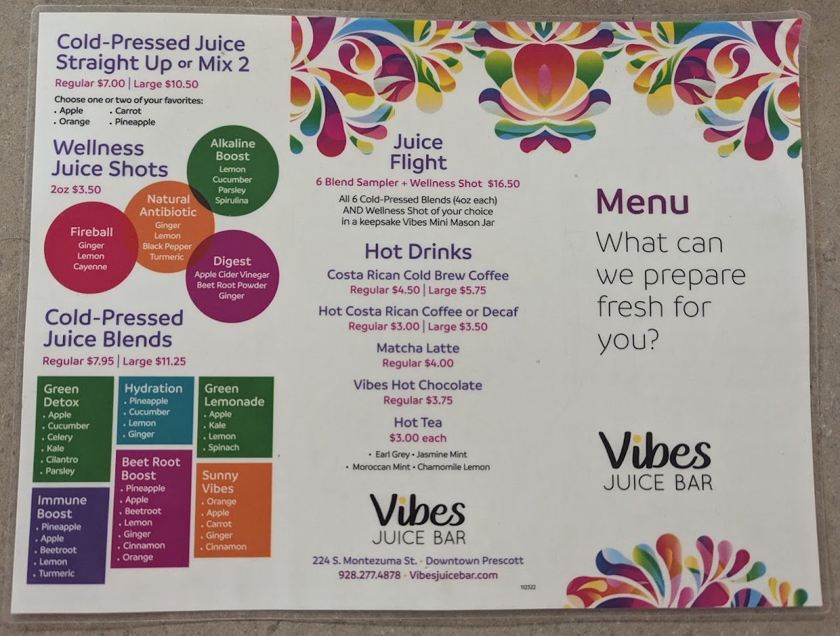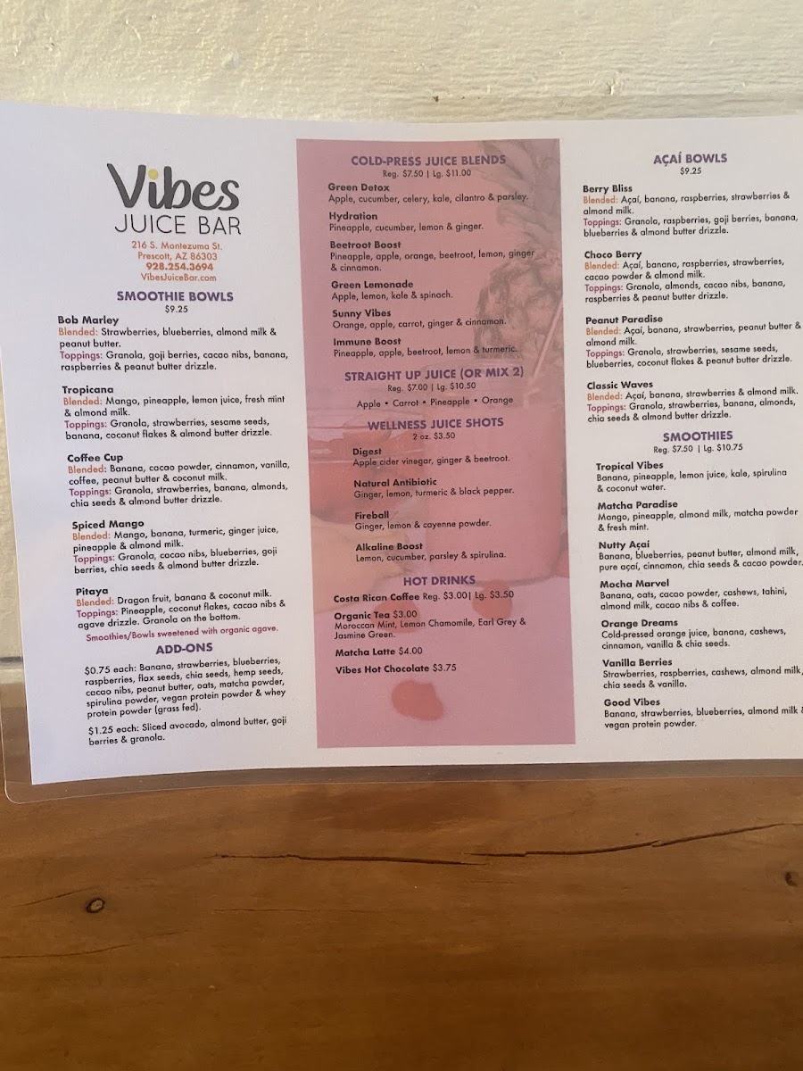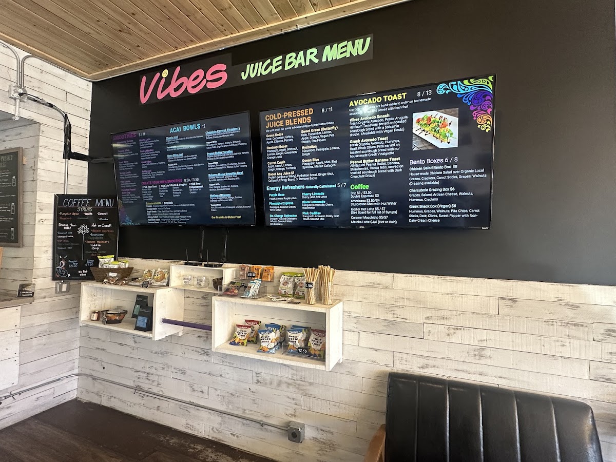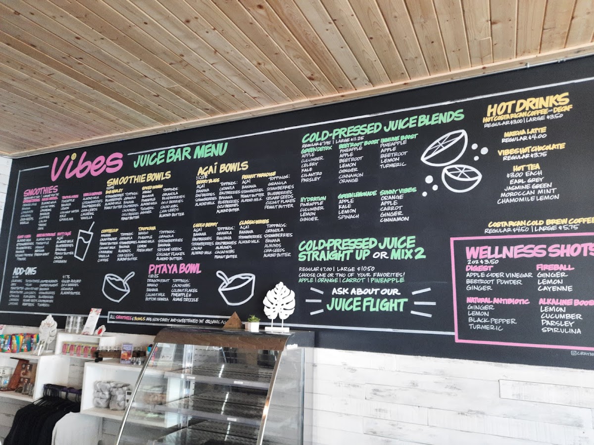 Vibes Juice Bar offers an exciting and vibrant menu that caters to a variety of tastes and dietary preferences. The smoothie selection includes delightful options like Tropical Vibes, Classic Strawberry Banana, and Mango Crush Cherry Berry Twist, with prices ranging from $7 to $10. For those seeking a heartier option, the smoothie and acai bowls are a great choice, with favorites like Classic Acai and the indulgent Peanut Butter Paradise. The cold-pressed juices are equally tempting, featuring blends like Green Detox, Hydration, and Beet Root Boost. If you're craving a quick health boost, the wellness juice shots like Fireball and Wheatgrass are available for just $3. The beverage menu also includes a variety of hot and cold drinks, including the bold Costa Rican Cold Brew Coffee and the creamy Cold-Brew Latte. Unique to the menu is the Juice Flight, which is a fun way to sample multiple cold-pressed juices. For those with a savory craving, Gourmet Toast options like Vibes Avocado Smash and Mediterranean Special are served with fresh fruit and priced at $8 or $14. Salads and wraps, such as the Moroccan Quinoa Power Bowl and Spicy Peanut Wrap (both vegan), are perfect for a nutritious grab-and-go meal. For a refreshing, energizing drink, their Lotus Natural Energy Drinks, like Disco Lemonade and Purple Haze, are a must-try. With its diverse and health-conscious menu, Vibes Juice Bar provides something for everyone, from juices to bowls, wraps, and energy-boosting drinks.