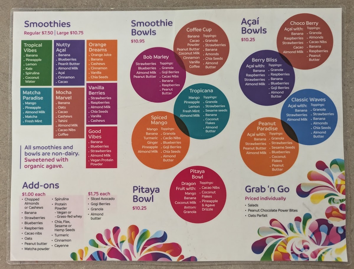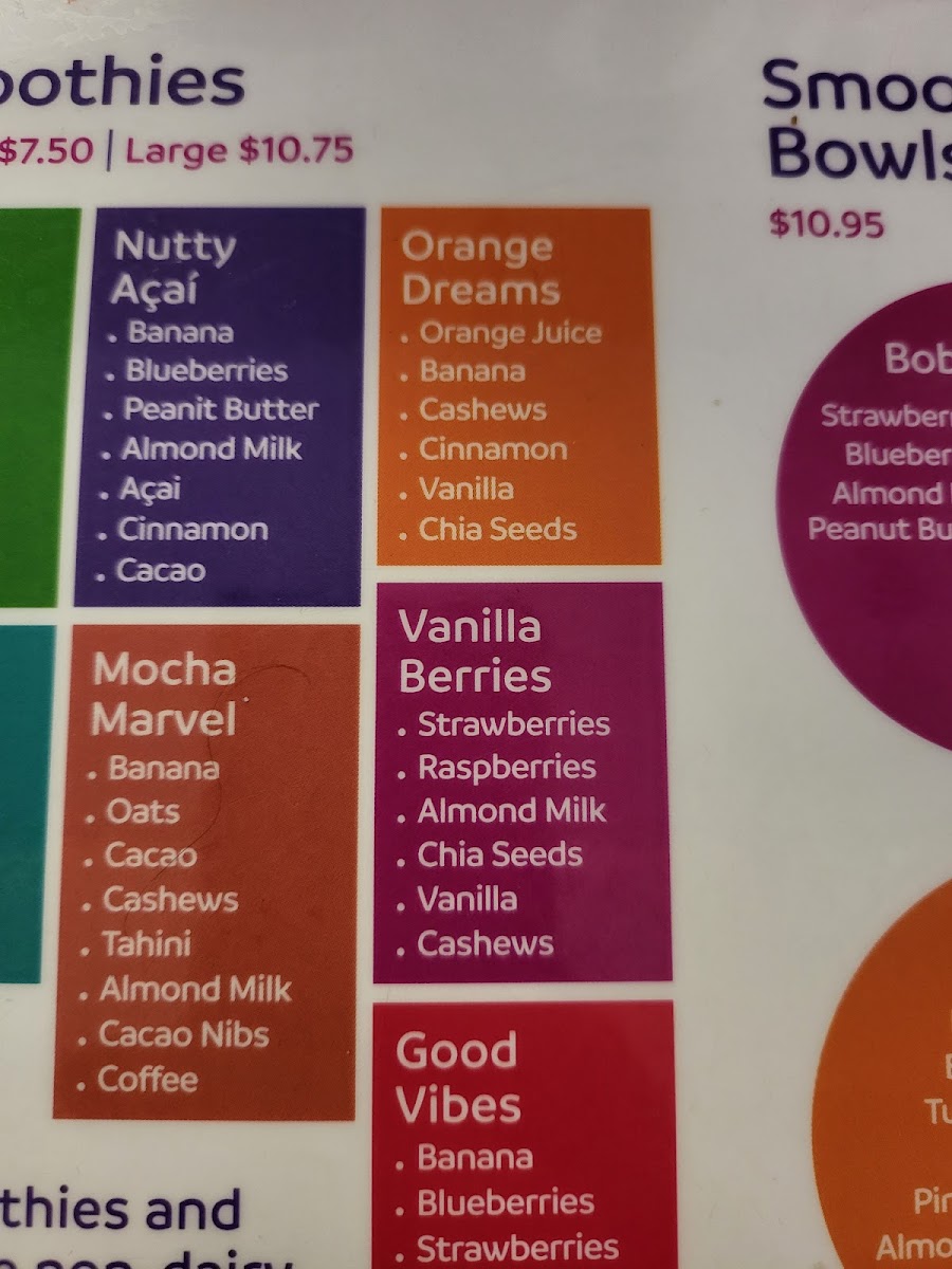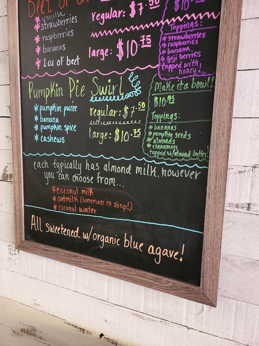 Pick your base – Almond Milk, Orange Juice, Apple Juice, Coconut Water, Coconut Milk Pick your fruit and veggies – Strawberries, Banana, Blueberries, Raspberries, Mango, Pineapple, Kale, Spinach Pick your enhancement – Protein, Energy Shot, CBD, Super Seed (Flax, Chia, Hemp) or Marine Collagen